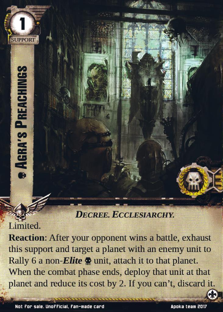 Reaction: After your opponent wins a battle, exhaust this support and target a planet with an enemy unit to rally 6 a non-Elite Astra Militarum unit, attach it to that planet. When the combat phase ends, deploy that unit at that planet and reduce its cost by 2. If you can't, discard it.