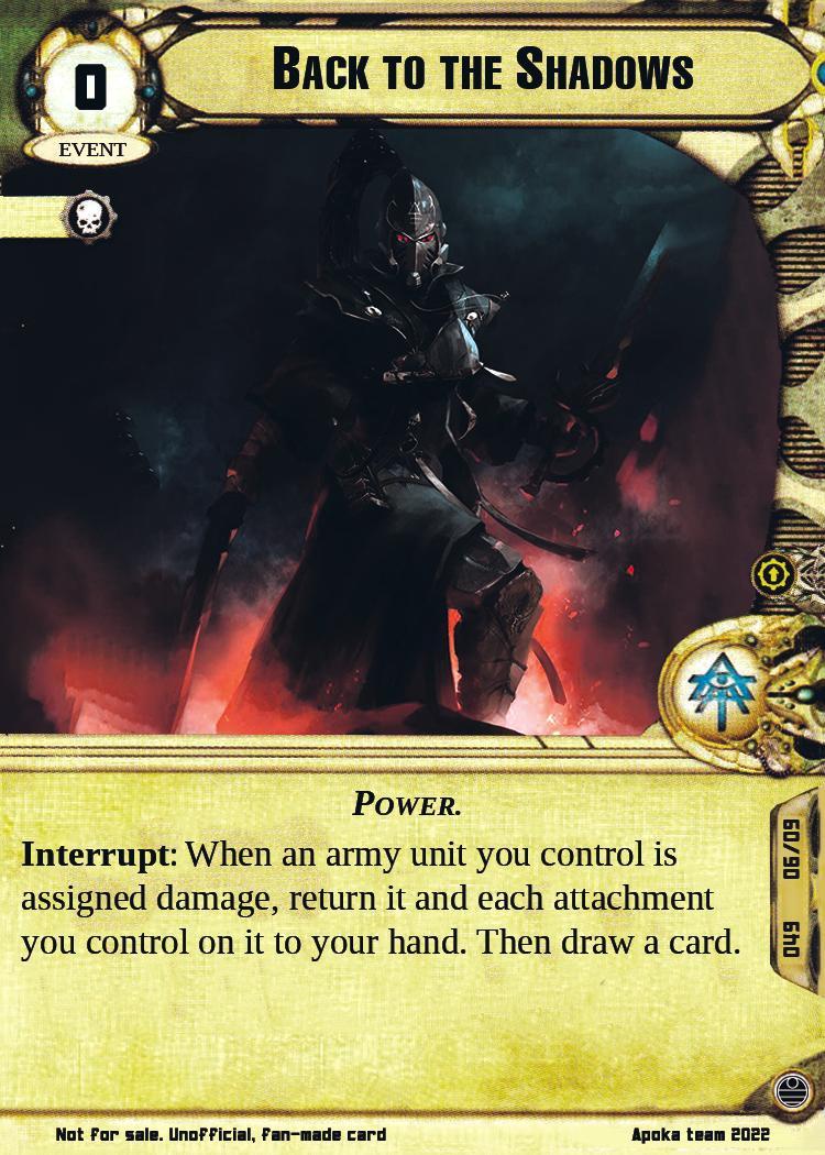 Interrupt: When an army unit you control is assigned damage, return it and each attachment you control on it to your hand. Then draw a card.