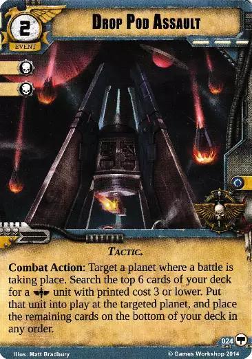 Combat Action: Target a planet where a battle is taking place. Search the top 6 cards for a Space Marines unit with printed cost 3 or lower. Put that unit into play at the targeted planet, and place the remaining cards on the bottom of your deck in any order.