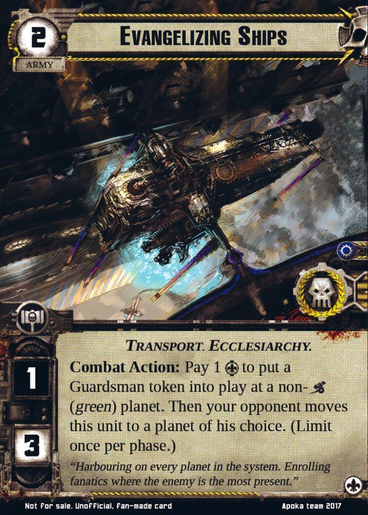 Combat Action: Pay 1 faith to put a Guardsman token into play at a non-green planet. Then your opponent moves this unit to a planet of his choice. (Limit once per phase.)