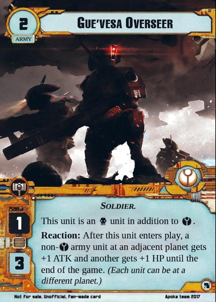 Reaction: After this unit enters play, a non-Tau army unit at an adjacent planet gets +1 ATK and another gets +1 HP until the end of the game. (Each unit can be at a different planet.)