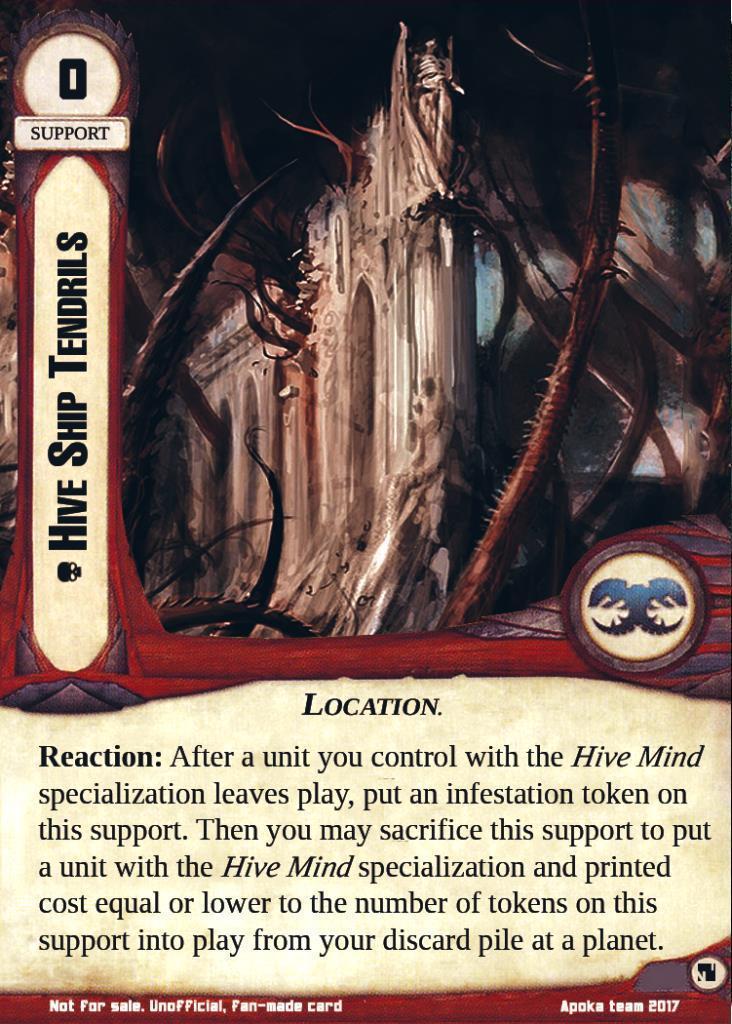 Reaction: After a unit you control with the Hive Mind specialization leaves play, put an infestation token on this support. Then you may sacrifice this support to put a unit with the Hive Mind specialization and printed cost equal or lower to the number of tokens on this support into play from your discard pile at a planet.