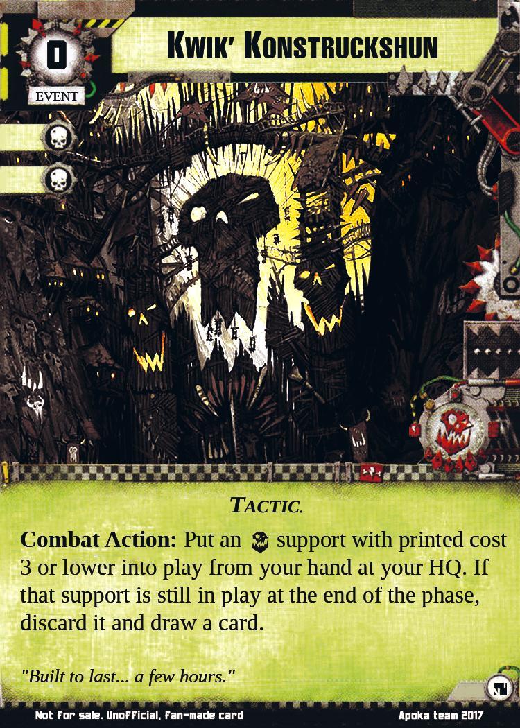 Combat Action: Put an Orks support with printed cost 3 or lower into play from your hand at your HQ. If this support is still in play at the end of the phase, discard it and draw a card.