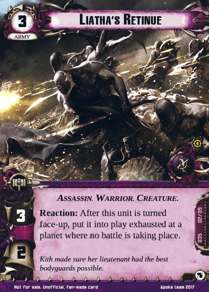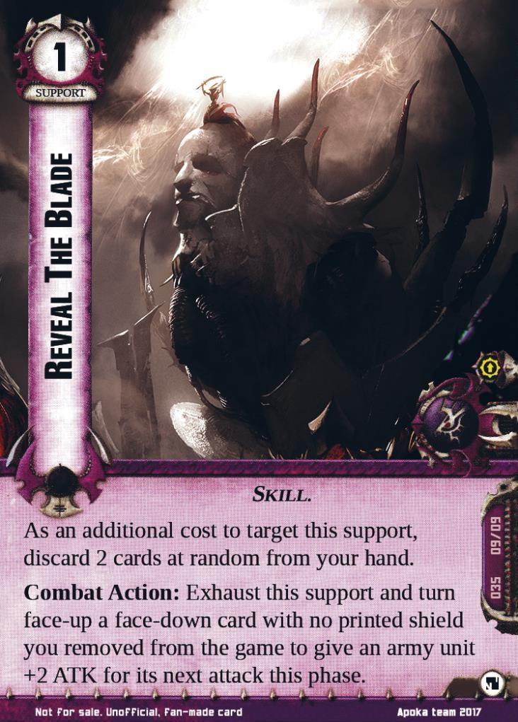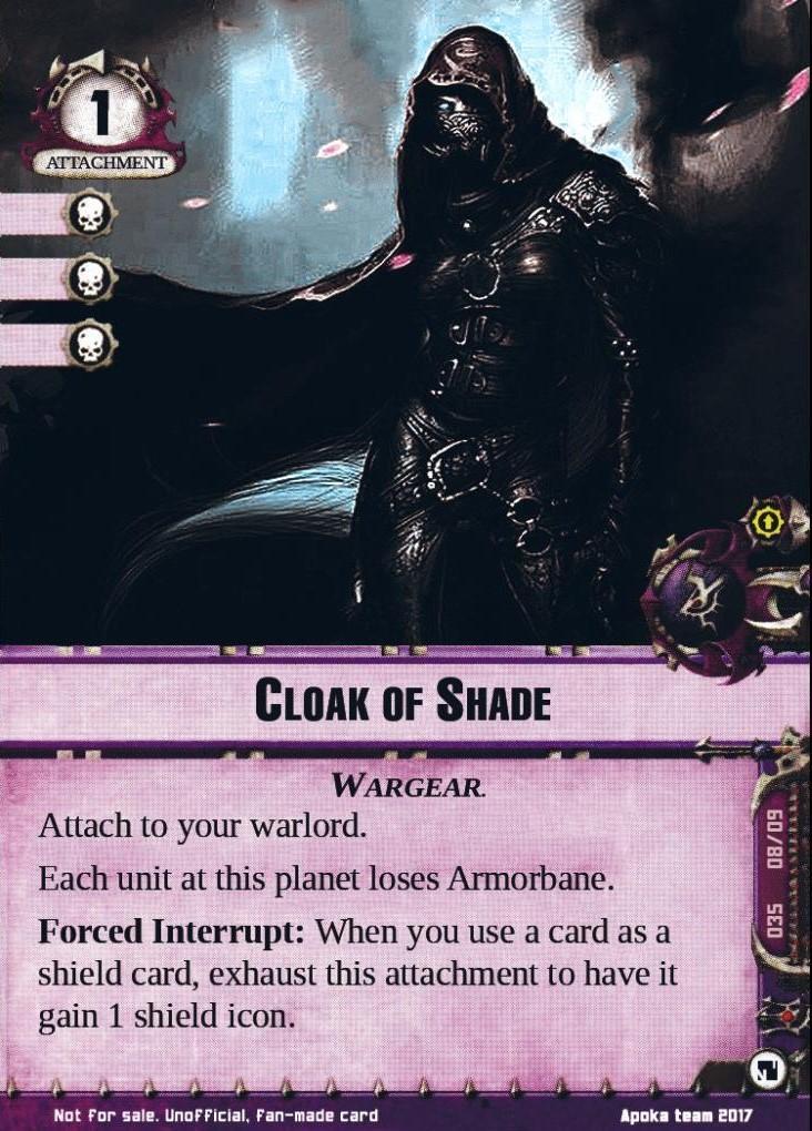 Cards in your hand may be used as shield cards with 2 shield icons. When you use a card this way, remove it from the game face-down. As an interrupt your opponent may have you turn the card face-up, if it is a card with 2 printed shield icons, deal 1 unpreventable damage to a unit. If not, cancel that card's shielding effect. (Limit three times per phase.)