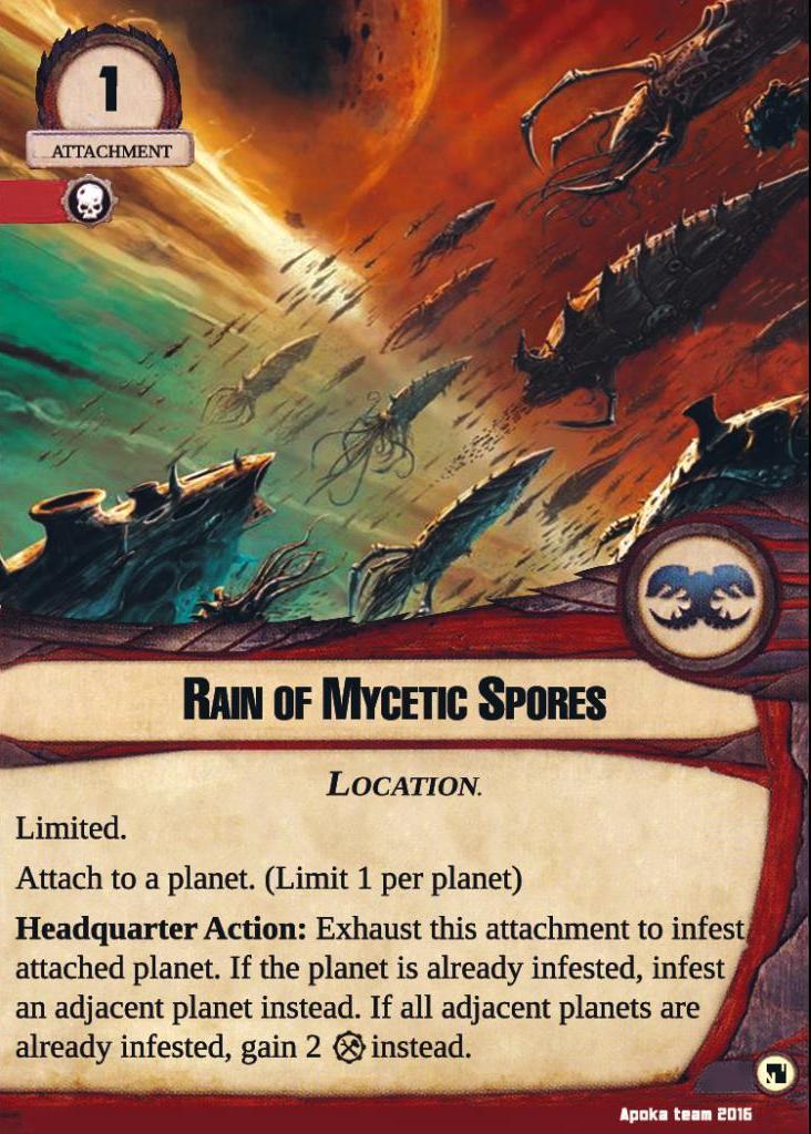 Headquarters Action: Exhaust this attachment to infest attached planet. If the planet is already infested, infest an adjacent planet instead. If all adjacent planets are already infested, gain 2 RESOURCE instead.