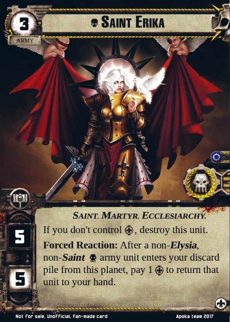 Forced Reaction: After a non-Elysia, non-Saint Astra Militarum army unit enters your discard pile from this planet, pay 1 faith to return that unit to your hand.