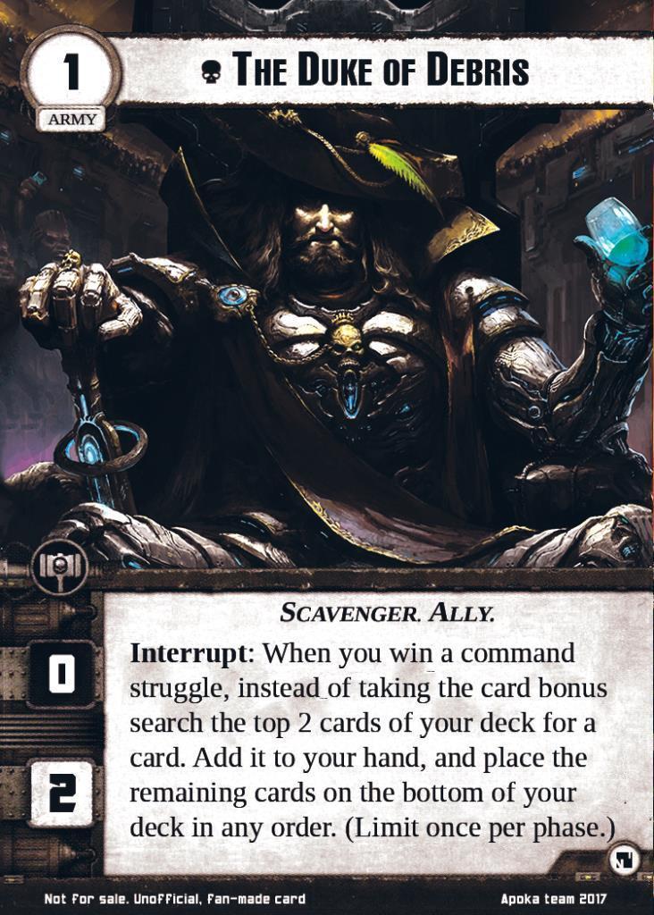 Interrupt: When you win a command struggle, instead of taking the card bonus search the top 2 cards of your deck for a card. Add it to your hand, and place the remaining cards on the bottom of your deck in any order. (Limit once per phase.)