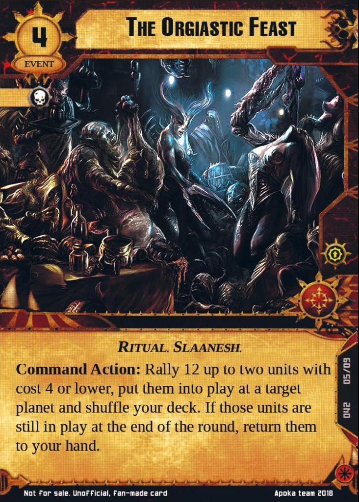 Command Action: Rally 12 up to two units with cost 4 or lower, put them into play at a target planet and shuffle your deck. If those units are still in play at the end of the round, return them to your hand.