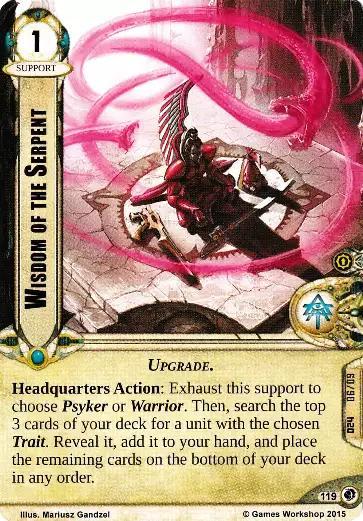 HEADQUARTERS ACTION: Exhaust this support to choose Psyker or Warrior. Then, search the top 3 cards of your deck for a unit with the chosen Trait. Reveal it, add it to your hand, and place the remaining cards on the bottom of your deck in any order.