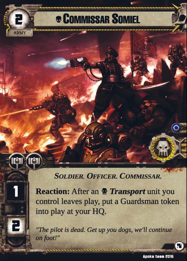 Reaction: After an Astra Militarum Transport unit you control leaves play, put a Guardsman token into play at your HQ.