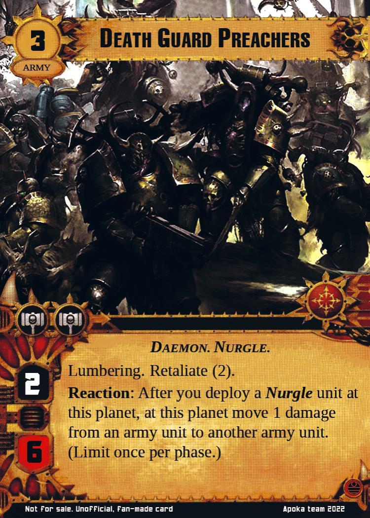 Reaction: After you deploy a Nurgle unit at this planet, at this planet move 1 damage from an army unit to another army unit. (Limit once per phase.)