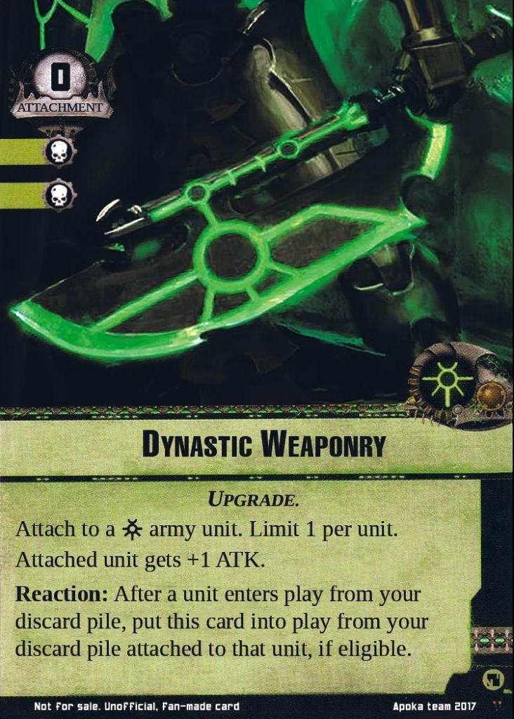 Reaction: After a unit enters play from your discard pile, put this card into play from your discard pile attached to that unit, if eligible.