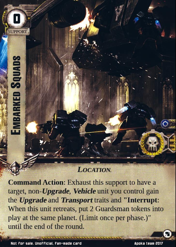 Command Action: Exhaust this support to have a target, non-Upgrade, Vehicle unit you control gain the Upgrade and Transport traits and "Interrupt: When this unit retreats, put 2 Guardsman tokens into play at the same planet. (Limit once per phase.)" until the end of the round.