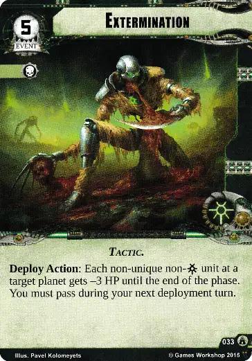 Deploy Action: Each non-unique non-Necrons unit at a target planet gets -3 HP until the end of the phase. You must pass during your next deployment turn.
