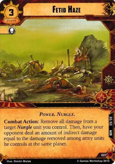 Combat Action: Remove all damage from a target Nurgle unit you control. Then, have your opponent deal an amount of indirect damage equal to the damage removed among army units he controls at the same planet.