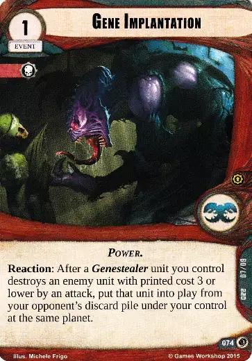 Reaction: After a Genestealer unit you control destroys an enemy unit with printed cost 3 or lower by an attack, put that unit into play from your opponent's discard pile under your control at the same planet.