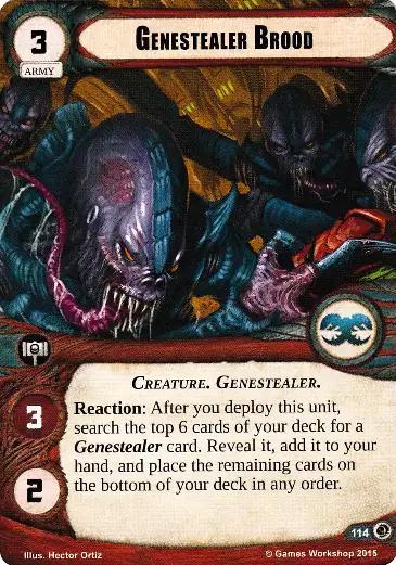 Reaction: After you deploy this unit, search the top 6 cards of your deck for a Genestealer card. Reveal it, add it to your hand, and place the remaining cards on the bottom of your deck in any order.
