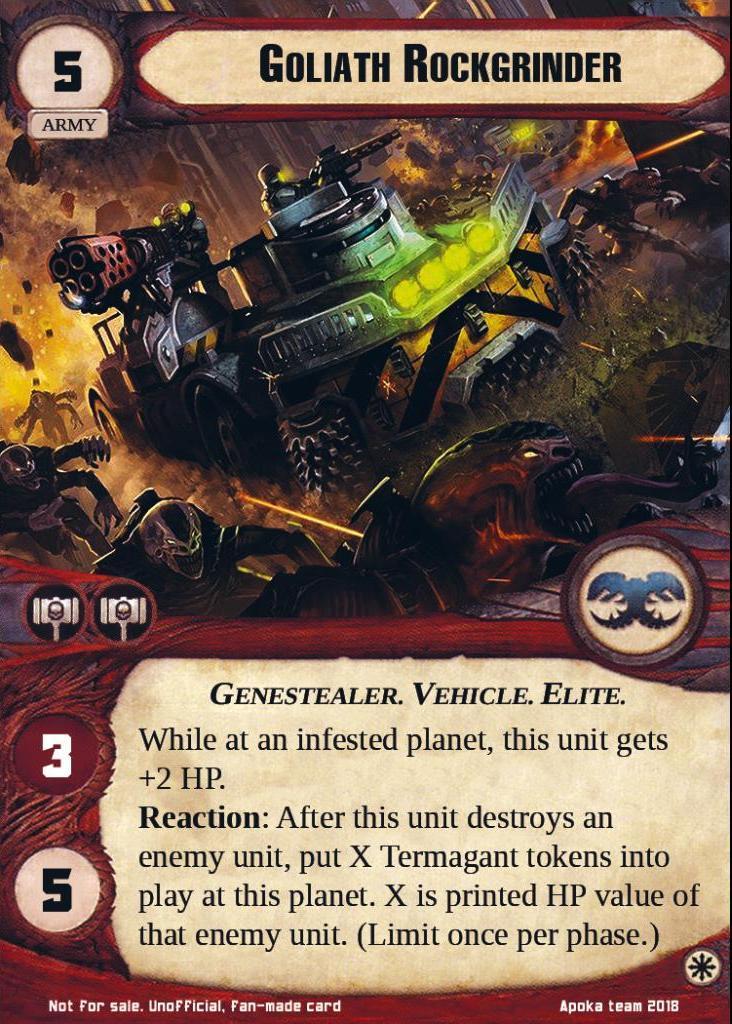 Reaction: After this unit destroys an enemy unit, put X Termagant tokens into play at this planet. X is the printed HP value of that enemy unit. (Limit once per phase.)