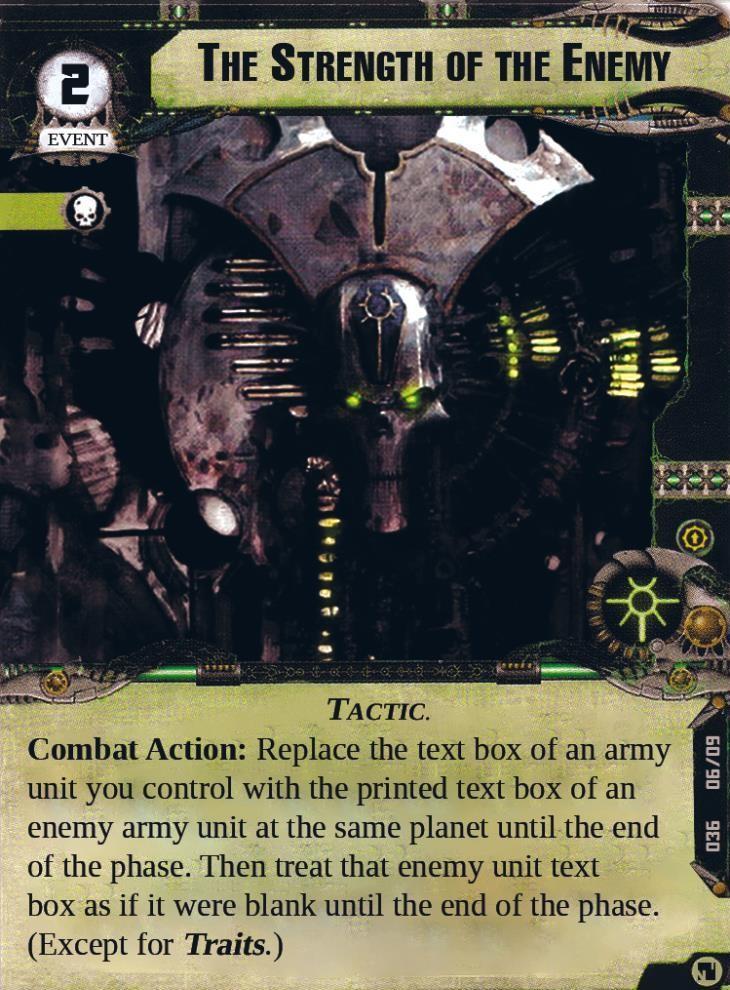 Combat Action: Remove a non-unique non-Eilte card in your discard pile from the game to switch its textbox (except for Traits) with a non-unique non-Elite card of the same type under your control until the end of the phase. (Limit once per phase.)