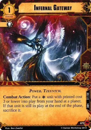 Combat Action: Put a Chaos unit with printed cost 3 or lower into play from your hand at a planet. If that unit is still in play at the end of the phase, sacrifice it.
