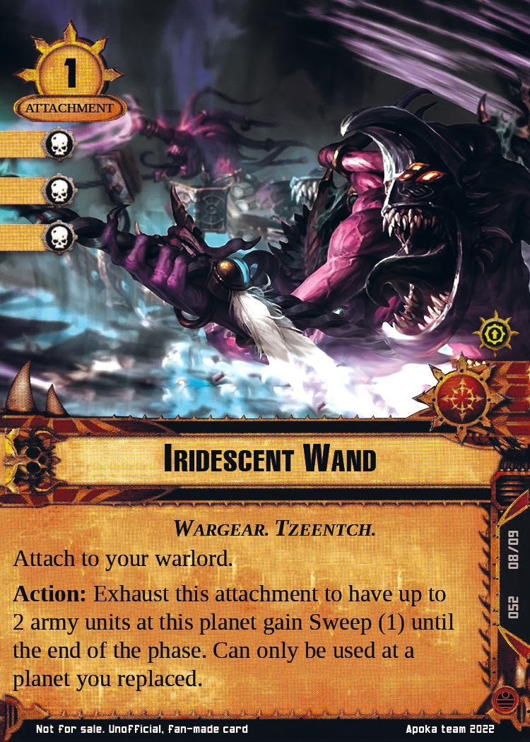 Action: Exhaust this attachment to have up to 2 army units at this planet gain Sweep (1) until the end of the phase. Can only be used at a replaced planet.