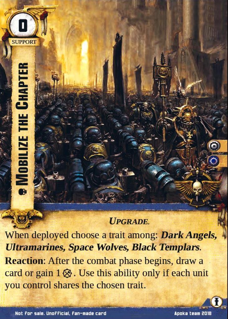 When deployed choose a trait among: Dark Angels, Ultramarines, Space Wolves, Black Templars.