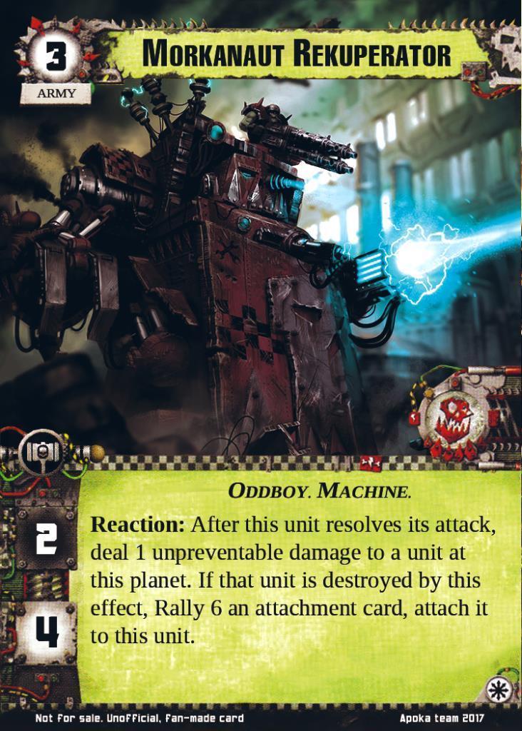 Reaction: After this unit resolves its attack, deal 1 unpreventable damage to a unit at this planet. If that unit is destroyed by this effect, Rally 6 an attachment card, attach it to this unit.