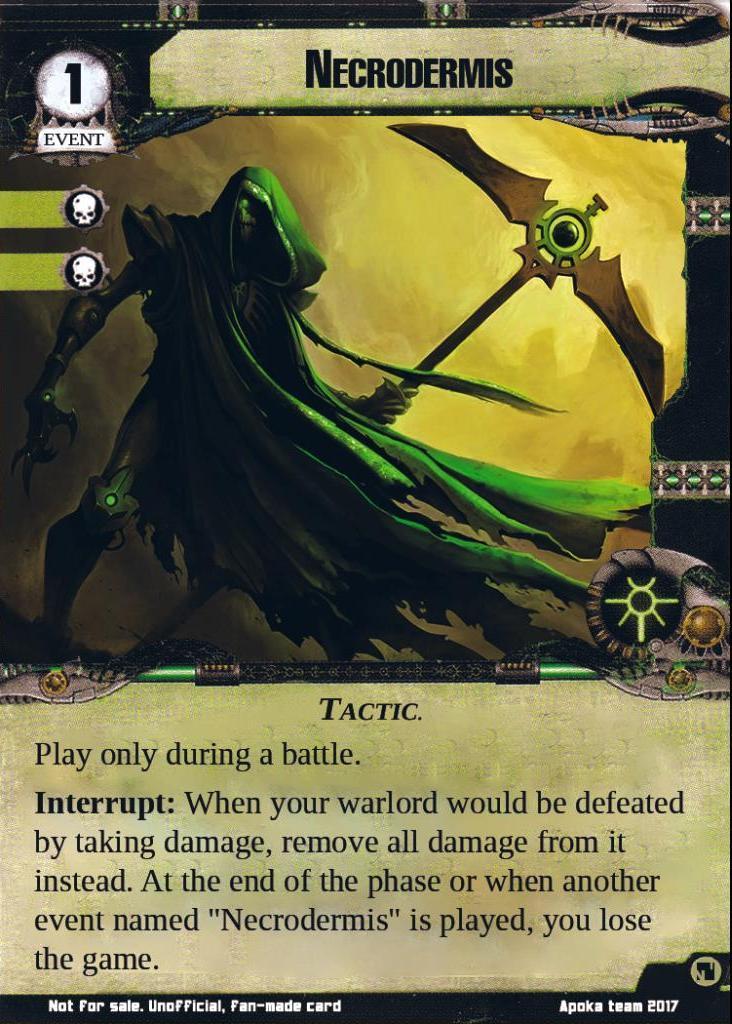 Interrupt: When your warlord would be defeated by taking damage, remove all damage from it instead. At the end of the phase or when another event named "Necrodermis" is played, you lose the game.