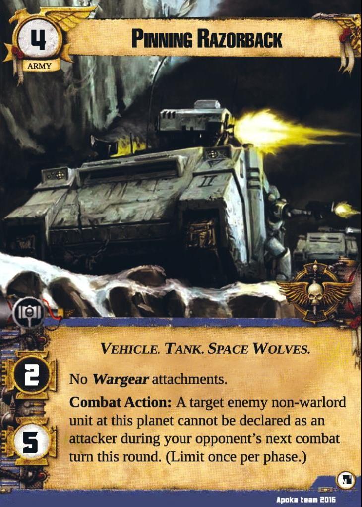 Combat Action: A target enemy non-warlord unit at this planet cannot be declared as an attacker during your opponent's next combat turn this round. (Limit once per phase.)