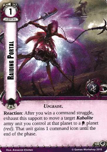 Reaction: After you win a command struggle, exhaust this support to move a target Kabalite army unit you control at that planet to a Material planet (red). That unit gains 1 command icon until the end of the phase.