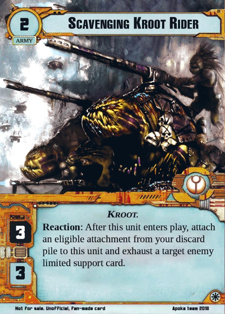 Reaction: After this unit enters play, attach an eligible attachment from your discard pile to this unit and exhaust a target enemy limited support card.