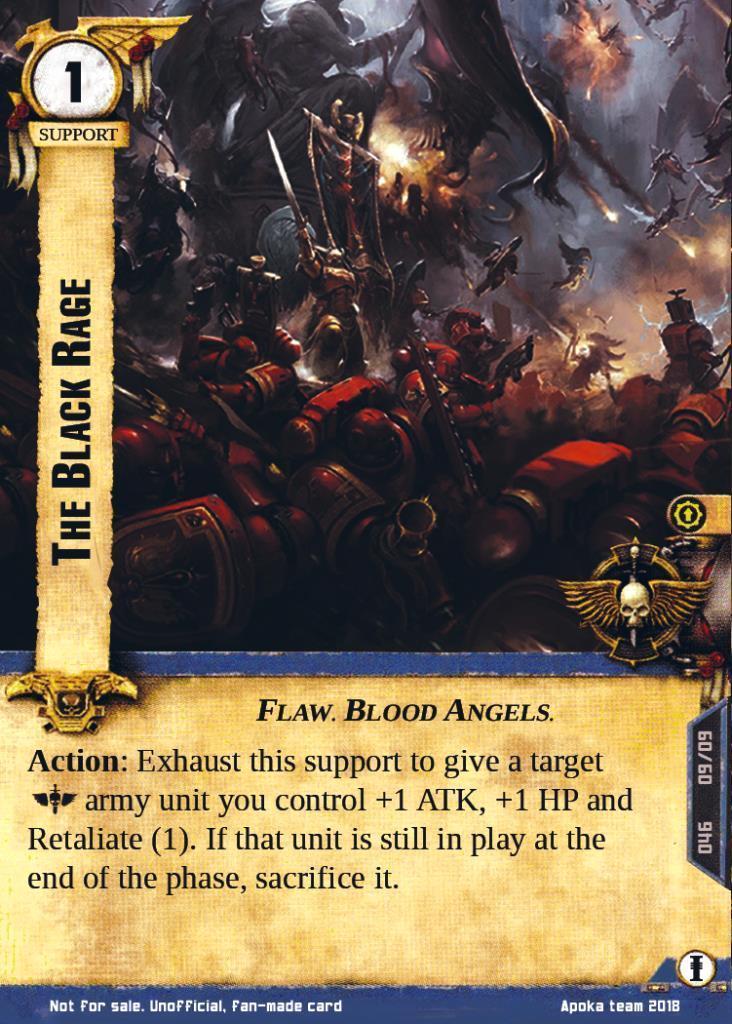 Action: Exhaust this support to give a target Space Marines army unit you control +1 ATK, +1 HP and Retaliate (1). If that unit is still in play at the end of the phase, sacrifice it.