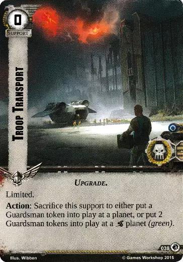 Action: Sacrifice this support to either put a Guardsman token into play at a planet, or put 2 Guardsman tokens into play at a Stronghold planet (green).