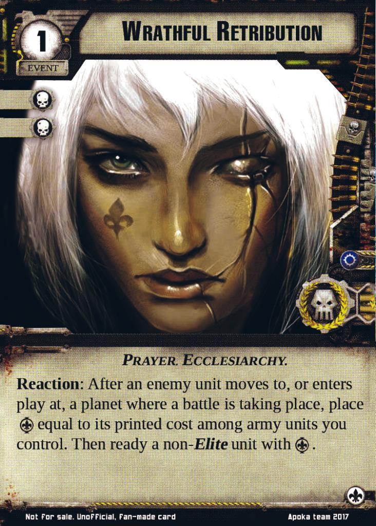 Reaction: After an enemy unit moves to, or enters play at, a planet where a battle is taking place, place faith equal to its printed cost among army units you control. Then ready a non-Elite unit with faith.